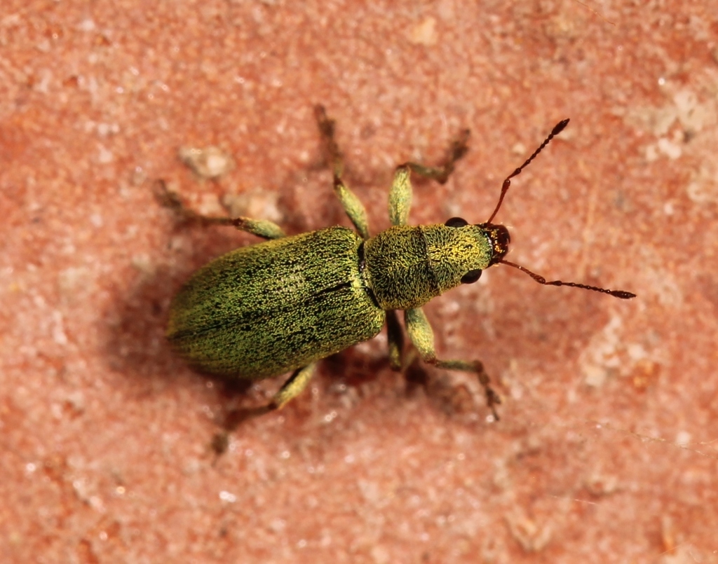 Ryjek krótki i szeroki, z wierzchu nagi, nie pokryty zielonymi łuskami – cecha diagnostyczna gatunku. Głowa wypukła, oczy małe i wypukłe, skronie długie. Przedplecze i pokrywy obficie pokryte zielonymi łuskami. Scutellum zielone. Nogi żółtobrązowe, pokryte zielonymi łuskami, zwłaszcza na udach i goleniach; przednie uda z wydatnym zębowatym wyrostkiem.