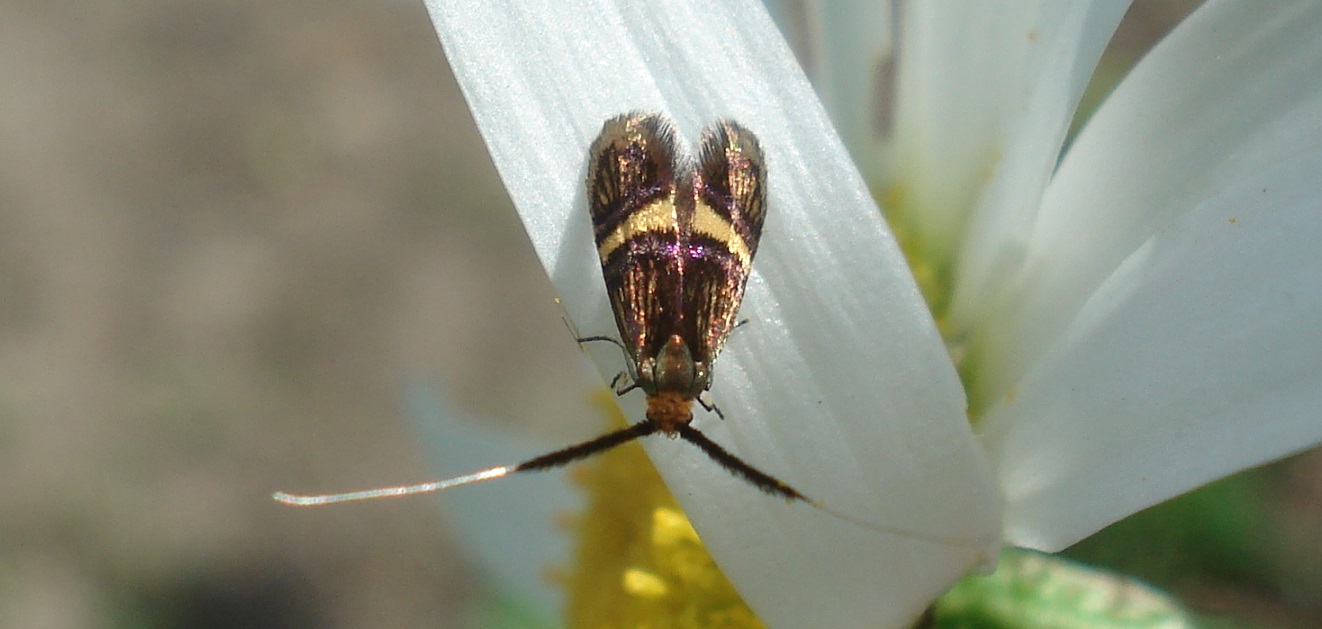 Na głowie pomarańczowa czuprynka, ewentualnie z pojedynczymi czarnymi akcentami. Skrzydła złocistożółte z szeroką żółtą przepaską i podłużnymi ciemnymi smugami; miejscami skrzydła z purpurowym połyskiem. Czułki samicy pogrubione w części nasadowej czarnofioletowymi łuskami; 1.5 razy dłuższe od skrzydeł. Czułki samca cienkie; dłuższe od skrzydeł 2.5-krotnie. O obu płci wierzchołki czułków białe.